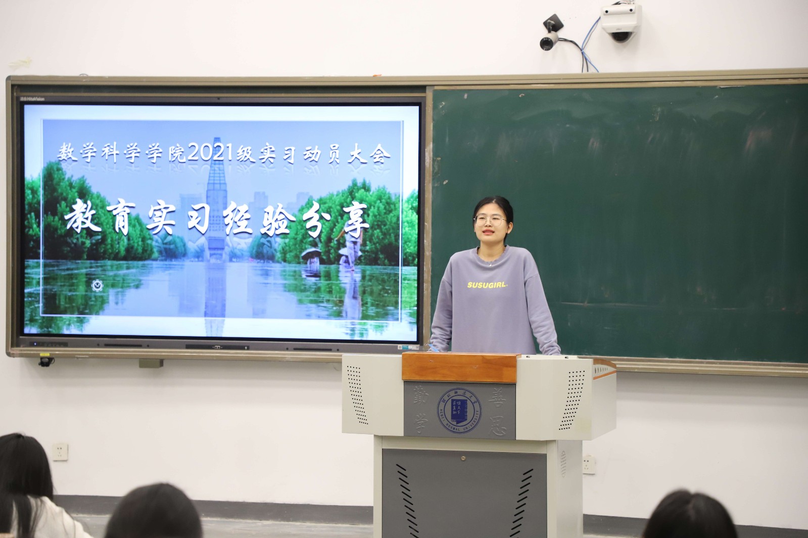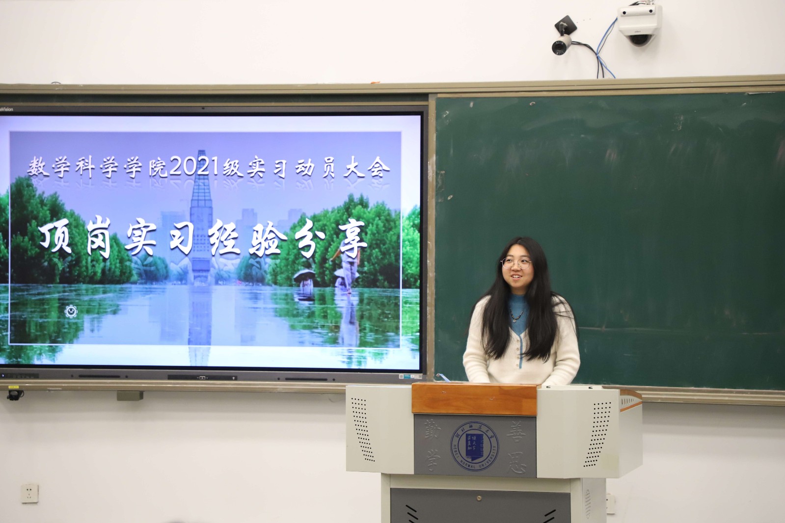 张春妹强调了实习的相关注意事项并就实习的选点原则进行了说明,学院本学期先后开展了教师技能训练营和教学技能大赛,通过不断说课磨课、粉笔字专项训练等,不断提升学生教学技能,坚定学生从教信心,助力学生走向三尺讲台。