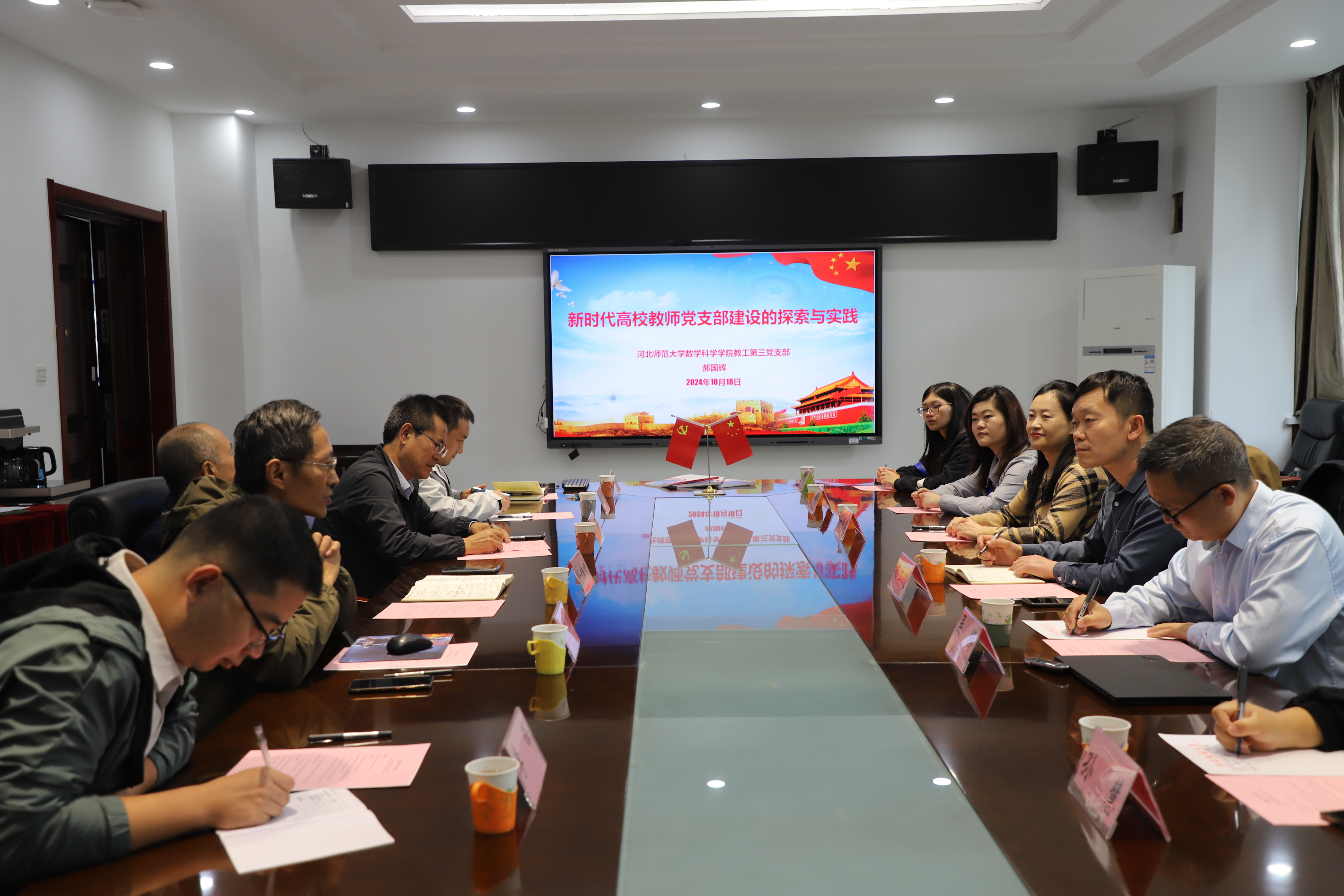 座谈会上,南开大学组合数学中心副主任、教工党支部副书记吴腾首先介绍了南开大学数学学科的发展历程与建设现状,分享了基层党建工作的有效做法与经验。威尼斯vns08866登录教工第三党支部支部书记郝国辉介绍了全国党建工作样板党支部的建设经验,交流了“师生共建”“党建与业务融合”等方面的特色工作与深刻体会。他强调,样板支部建设必须紧密契合学院中心工作,努力打造可复制、可推广的经验体系。随后,双方支部就制度建设、党日活动开展等进行了深入的交流探讨,现场气氛热烈。乔维新在总结讲话中指出,南开大学和河北师范大学共同传承红色革命基因,培养出许多著名的革命家和杰出校友,有着深厚的历史渊源,希望共建工作深入开展,强化党建引领,共谋学科发展。